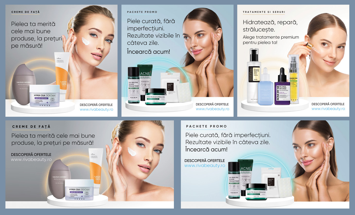 I created a vibrant and eye-catching advertising banners for Rivabeauty’s online campaign, designed to highlight their premium beauty products and elevate the brand's digital presence. The design reflects elegance and radiance, perfect for attracting beauty enthusiasts.